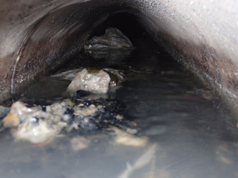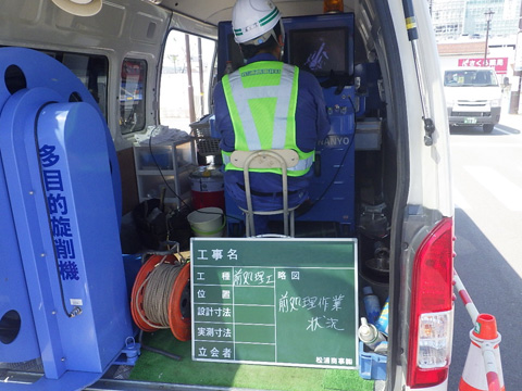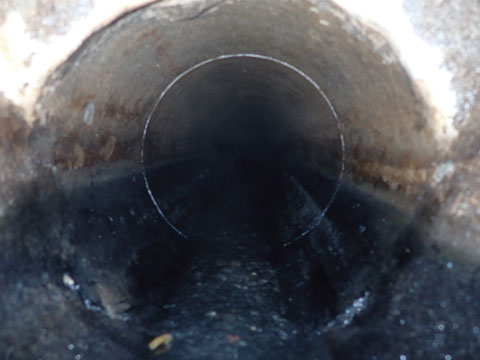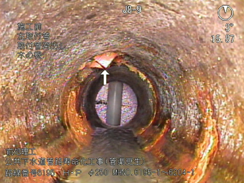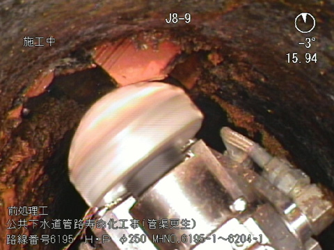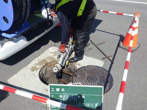 管内調査用TVカメラや簡易カメラを使用し、管内の映像を確認しながら除去作業をします。超高圧洗浄にて木の根を除去し、モルタル等の固形物は穿孔機などを使用し除去します。また、継手部分などの木の根は時間が経つと再度流下能力を阻害する恐れがあるので、部分的に補修をかける事も可能です。