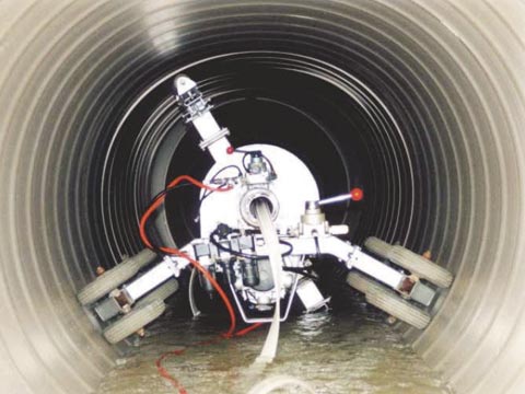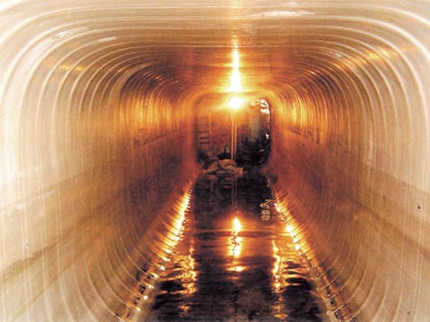 オールライナー工法は、工場で含浸された更生材を管内に引き入れた後、更生材に水圧または空気圧をかけ拡張し、温水または蒸気を循環させ樹脂を硬化形成させることによって、既設管きょ内に新しい管きょを形成する非開削の工法です。