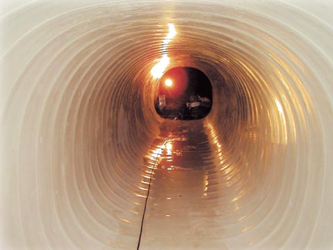 オールライナー Z 工法は、工場で含浸された更生材を管内に引き入れた後、更生材に水圧または空気圧をかけ拡張し、温水または蒸気を循環させ樹脂を硬化形成させることによって既設管きょに新しい管きょを形成する非開削の工法です。ガラス繊維を含んだ材料を使用することで強度を向上させており、また耐酸性ガラスの使用により、酸性雰囲気下での耐久性を向上させています。