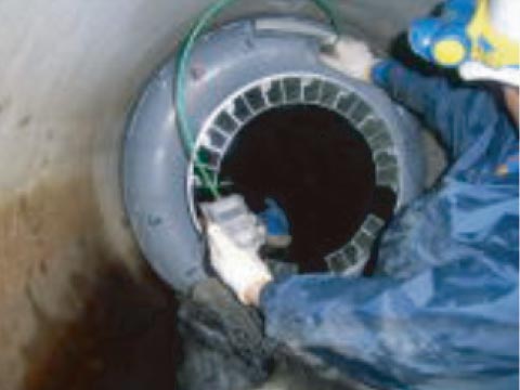 EPR-LS工法(取付管)は、ガラス繊維にエポキシ樹脂を含浸させたライニング材を施工現場で硬化させることにより老朽化した下水道管きょを非開削で更生する技術です。施工方法は、施工現場において常温硬化性エポキシ樹脂を含浸させたライニング材を桝から管内に引き入れ、空気圧で既設管きょ内面に圧着後、常温硬化させます。以上により、強度、耐久性に優れた下水道管きょを形成することが可能となります。